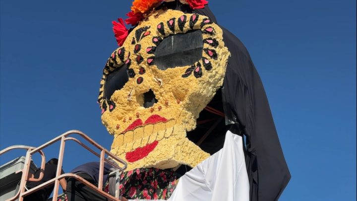 La monumental catrina fue elaborada con 50 metros de tela, varios kilos de madera, cazuelas, 50 litros de espuma y otros materiales, contando además con el respaldo de las autoridades municipales.