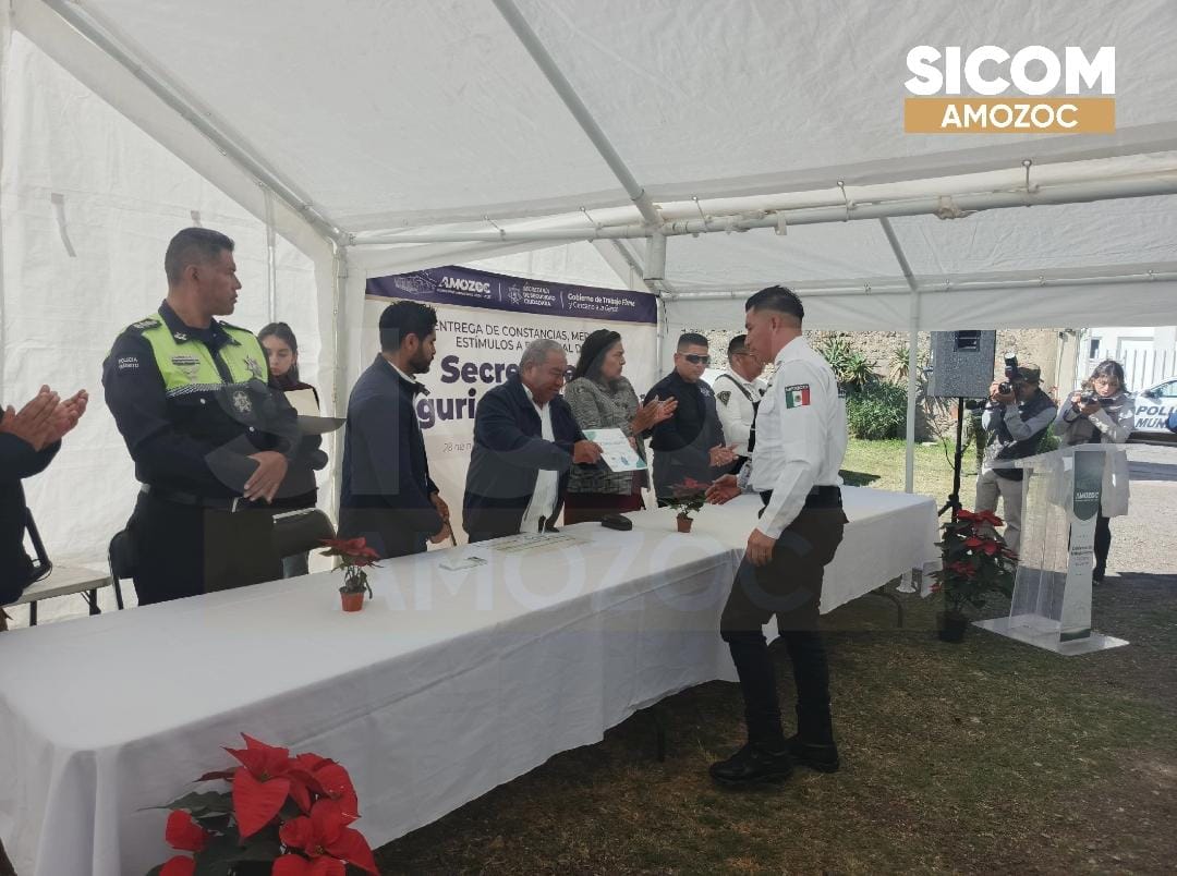 El Ayuntamiento de Amozoc entregó constancias, méritos y estímulos económicos a elementos de la Secretaría de Seguridad Ciudadana, evento que se llevó a cabo en el emblemático edificio Casa Colorada, con el propósito de reconocer el compromiso y la labor que las y los policías realizan diariamente en favor de la seguridad del municipio.