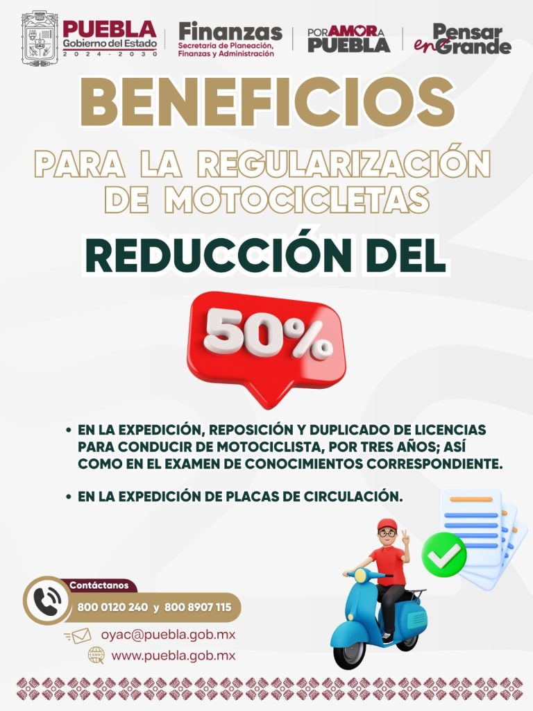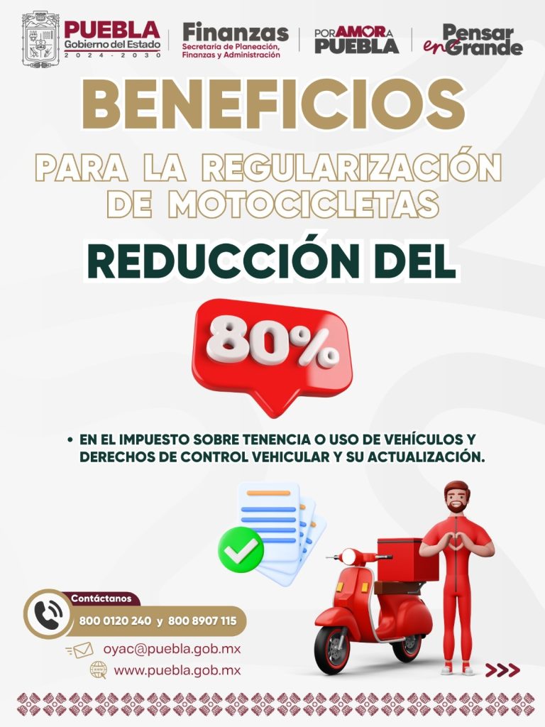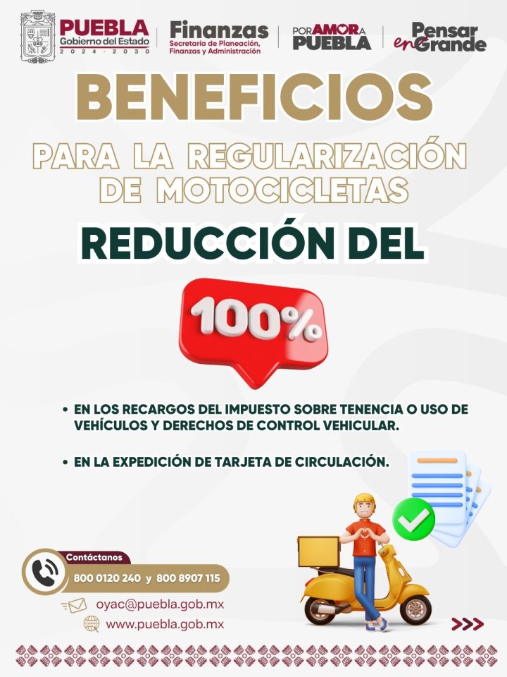 Con la finalidad de que las propietarias y los propietarios de motocicletas puedan cumplir con las disposiciones fiscales, el Gobierno del Estado de Puebla, a través de la Secretaría de Planeación Finanzas y Administración, implementó diversas acciones para la regularización de las unidades, que consisten en la reducción parcial del pago de las siguientes contribuciones: