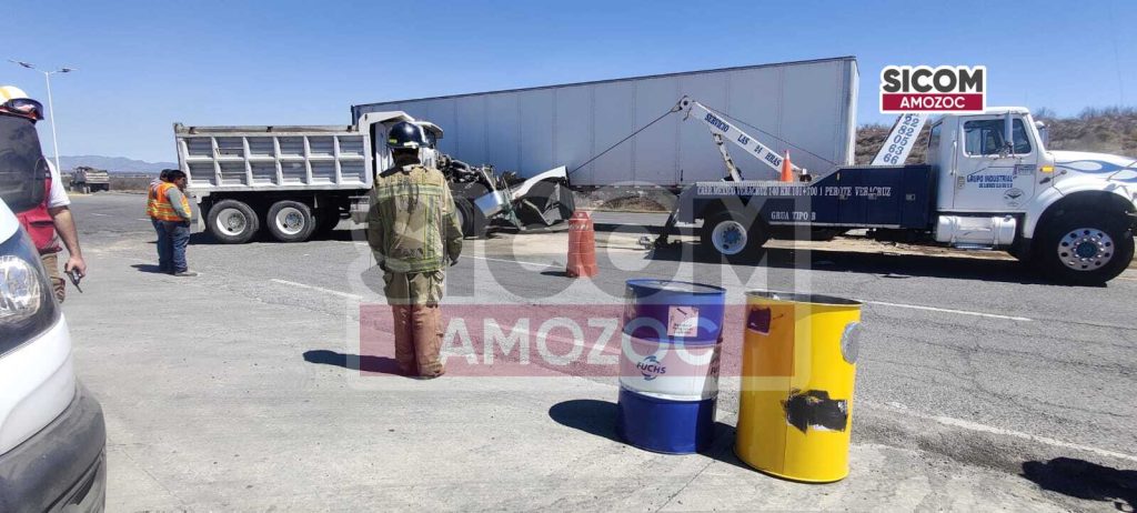 Tras el choque, el camión con caja seca presentó derrame de líquidos pétreos, por daños en el tanque de depósito del lado derecho. Mientras que, el tractocamión registró afectaciones en 80 por ciento en la parte del motor, lo que provocó derrame de gasolina y aceites, generando riesgo en la zona.