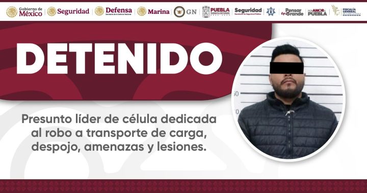 Derivado del monitoreo estratégico realizado desde el Centro de Control, Comando, Coordinación, Comunicaciones, Cómputo e Inteligencia (C5i), así como de un operativo interinstitucional desplegado en el municipio de Amozoc, se logró la detención de José N., identificado como presunto líder de un grupo delictivo dedicado al robo a transporte de carga, despojo, amenazas y lesiones.