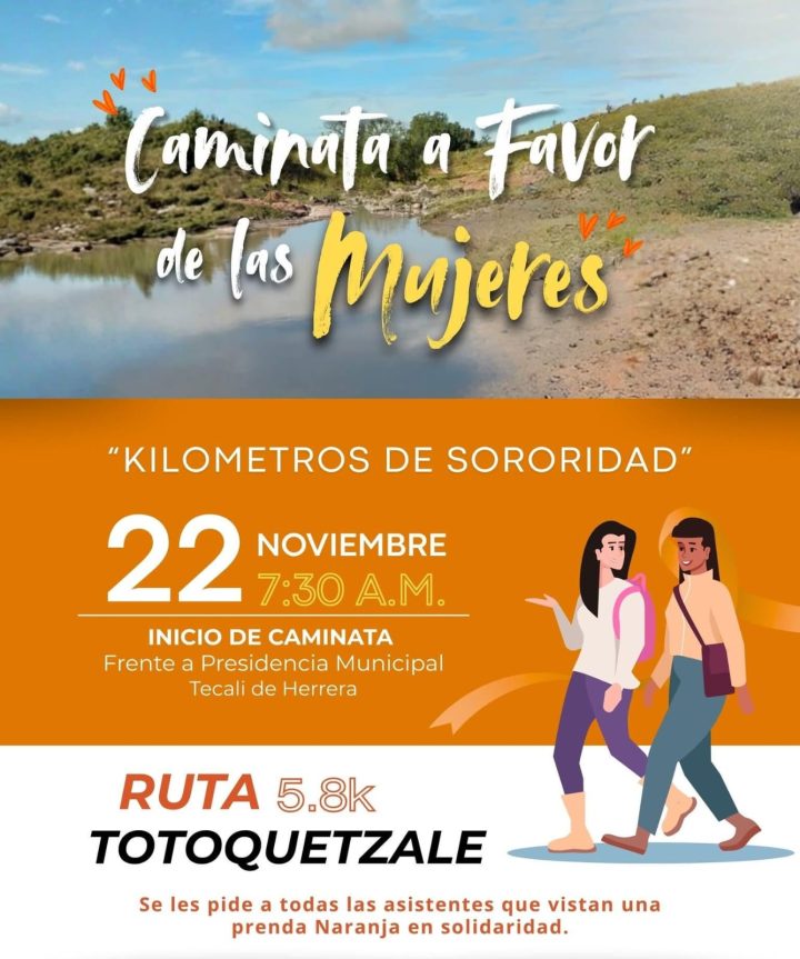 Con el objetivo de fortalecer la sororidad, promover la unión y visibilizar la importancia de los espacios seguros y de acompañamiento, el municipio de Tecali de Herrera llevará a cabo una Caminata a Favor de las Mujeres el próximo 22 de noviembre.
