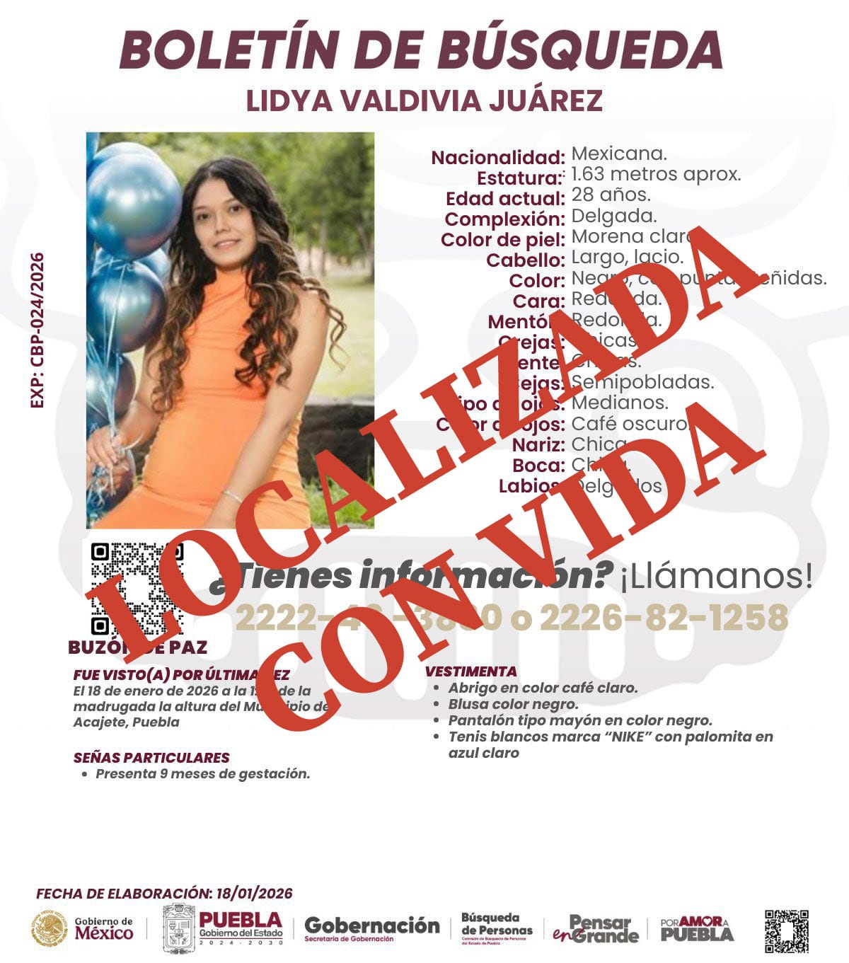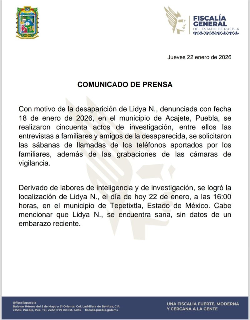 La Fiscalía General del Estado (FGE) de Puebla informó la localización de Lidya N., quien había sido denunciada como desaparecida desde el pasado 18 de enero de 2026 en el municipio de Acajete.