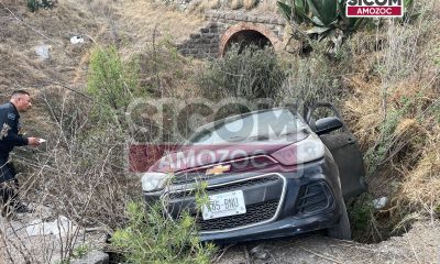 Un vehículo con placas del Estado de México cayó a una barranca de desagüe pluvial de aproximadamente cinco metros de profundidad. Los dos ocupantes resultaron ilesos.